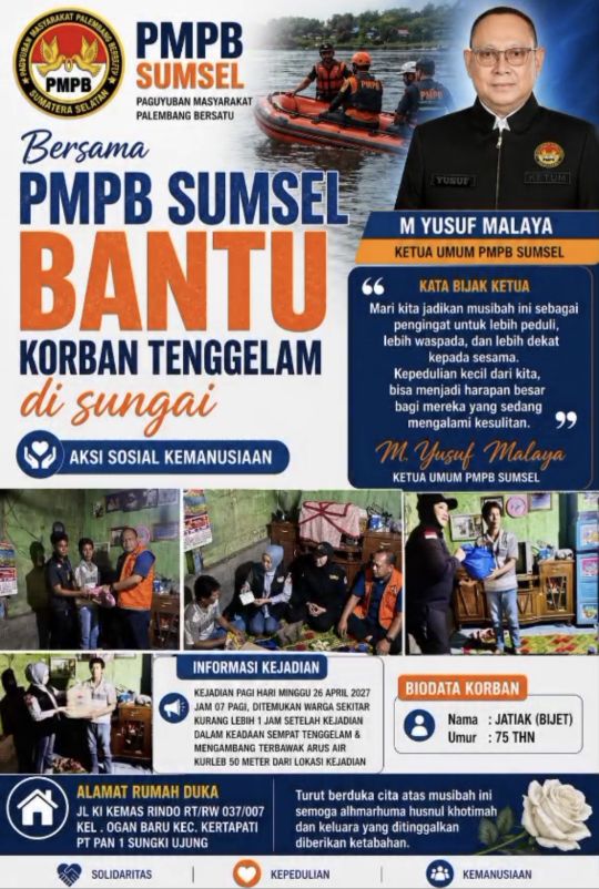 Palembang — Keluarga almarhumah Jatiak, korban tenggelam di Sungai Mataram, Kecamatan Kertapati, Palembang, menyampaikan ucapan terima kasih atas perhatian, kepedulian, dan bantuan yang diberikan oleh Ketua Umum Paguyuban Masyarakat Palembang Bersatu (PMPB) Sumatera Selatan, M. Yusuf Malaya.