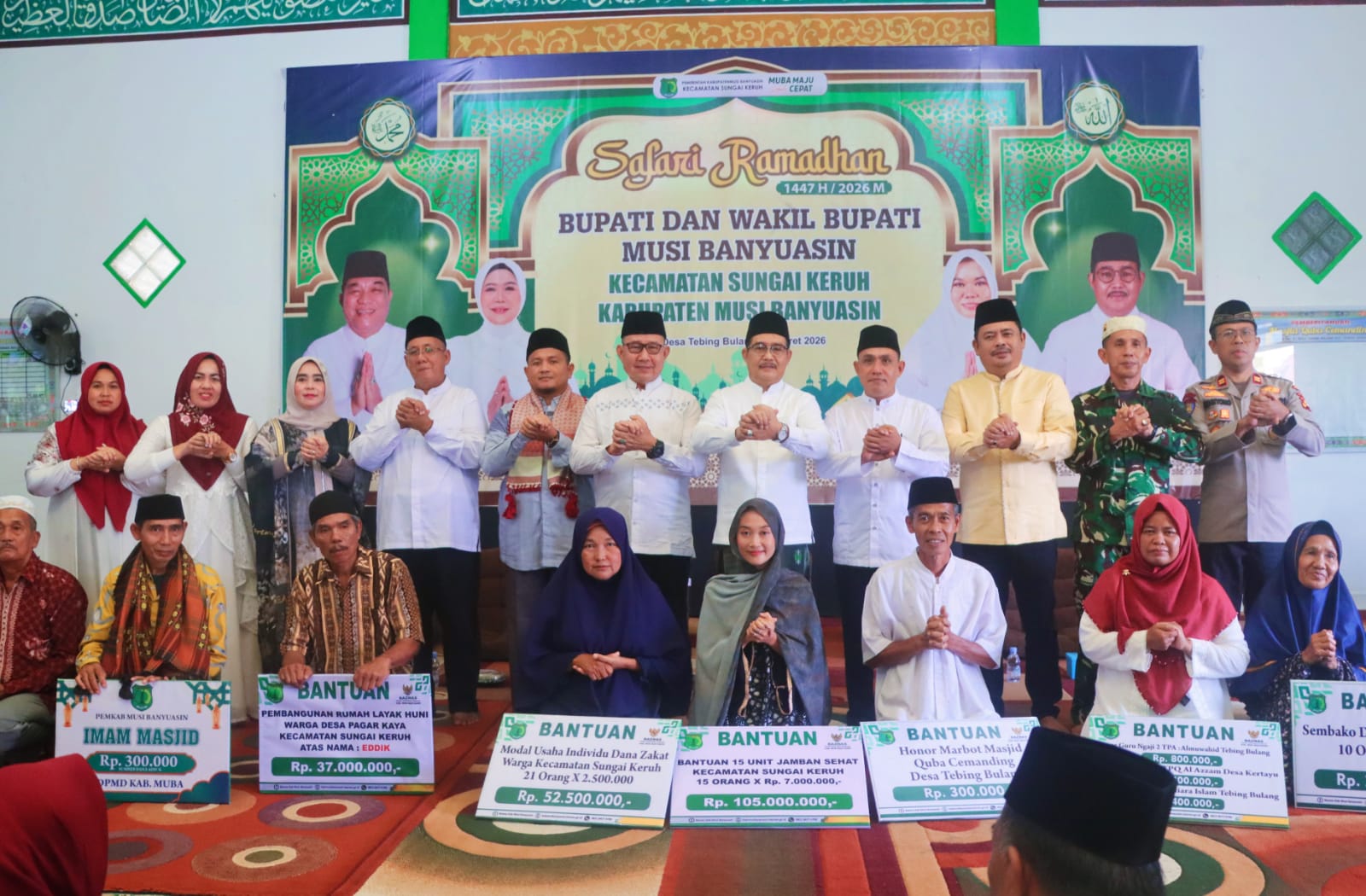 Dalam rangkaian kegiatan Safari Ramadhan tersebut, Wakil Bupati Musi Banyuasin juga menyerahkan berbagai bantuan secara simbolis, antara lain tali asih bagi imam masjid, ustaz dan ustazah, bantuan modal usaha bagi masyarakat, bantuan bagi kaum dhuafa, serta paket sembako, diakhiri dengan Ceramah Agama oleh Ustad Nizar dan berbuka puasa bersama.(Eggy)